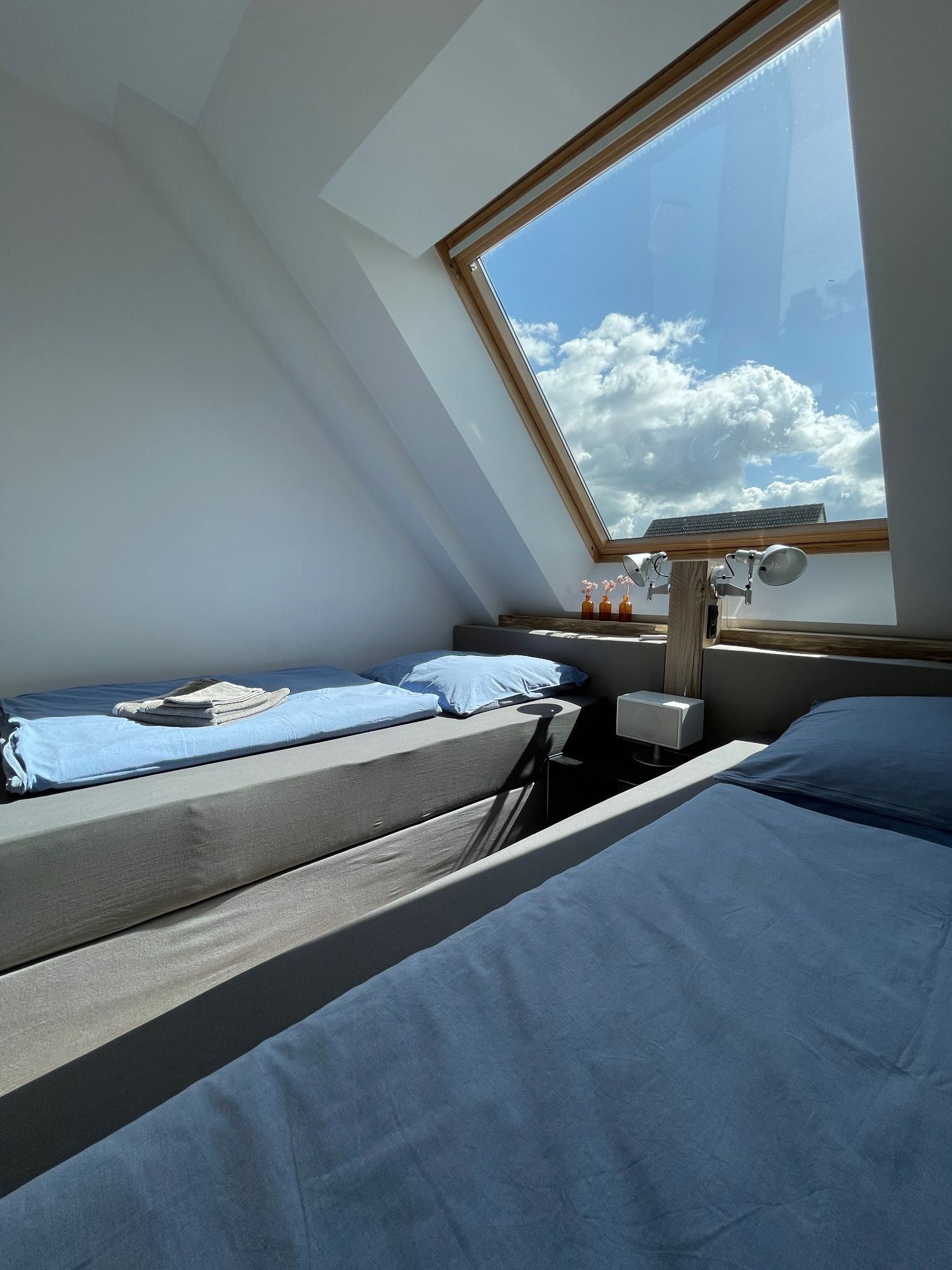 Wohn- und Schlafraum, Boxspringbett (Liegefäche 200×200), helles Parkett, voll ausgestattete Küche mit Toaster, Wasserkocher, Kühlschrank, Backofen, 2er Ceranfeld (alle Geräte von Miele und Bosch), Kaffeemaschine.